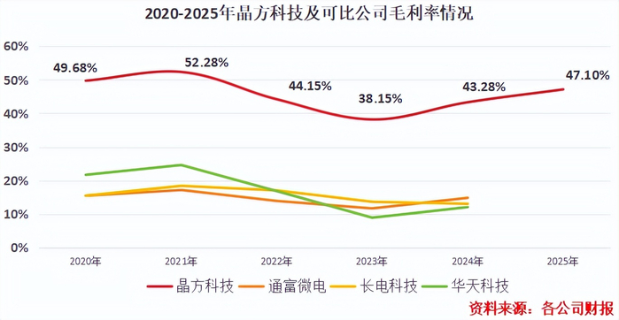 近6年内,晶方科技毛利率几乎都在40%以上,2025年毛利率更是提高近4个百分点达到47.1%。可以说,公司的盈利能力位居行业第一。