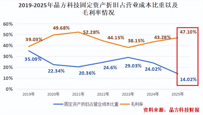 2019-2025年,晶方科技的毛利率与“固定资产折旧占营业成本比重”几乎呈现反比关系。