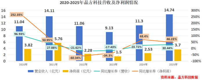 2月28日,晶方科技发布2025年年报:全年公司营收14.74亿元,创下历史新高,同比增长30.44%;净利润为3.7亿元,同比增长46.23%。
