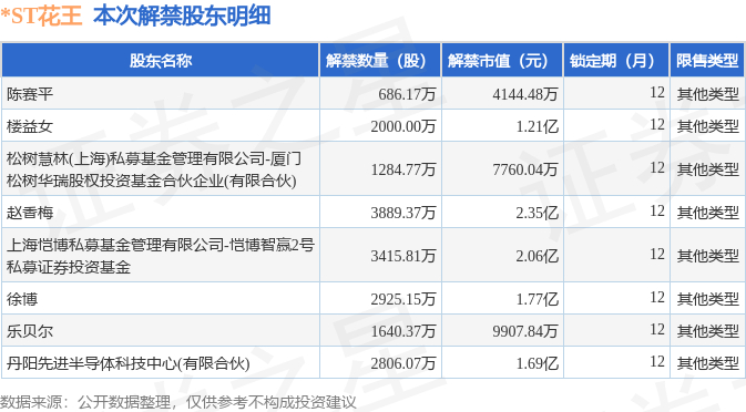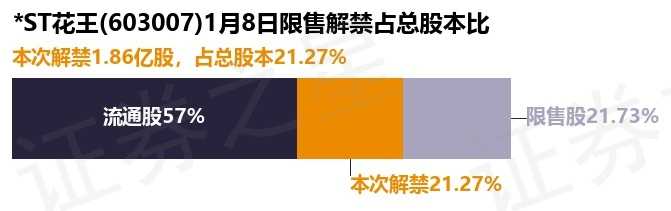 *ST花王(603007)1.86亿股限售股将于1月8日解禁,占总股本21.27%