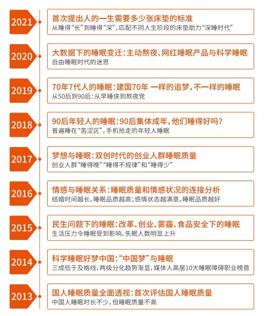 喜临门高度重视国人睡眠健康,自2012年开始便针对国人的睡眠行为开展调查并推出相关报告,这是目前国内持续时间最长的一项睡眠研究,也是唯一一个以中国人睡眠状况为研究对象的专业指标体系。11年来,每一年的“中国睡眠指数”所反映的问题都深刻映照当今时代的社会问题。