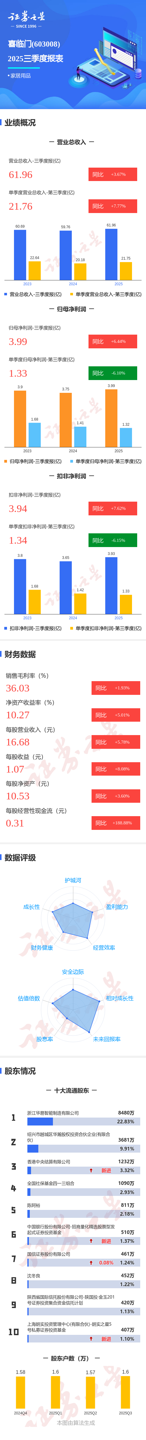 图解喜临门三季报:第三季度单季净利润同比下降6.10%