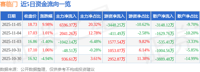 11月5日的资金流向数据方面,主力资金净流入6596.37万元,占总成交额20.32%,游资资金净流出3448.25万元,占总成交额10.62%,散户资金净流出3148.12万元,占总成交额9.7%。