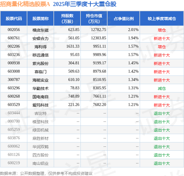 根据2025基金Q3季报公募基金重仓股数据,重仓该股的公募基金共6家,其中持有数量最多的公募基金为招商基金的招商量化精选股票A。招商量化精选股票A目前规模为36.63亿元,最新净值3.5659(12月30日),较上一交易日上涨0.15%,近一年上涨38.42%。该公募基金现任基金经理为王平。王平在任的基金产品包括:招商沪深300指数增强A,管理时间为2017年2月10日至今,期间收益率为84.23%;招商中证红利ETF,管理时间为2019年11月28日至今,期间收益率为101.92%;招商中证光伏产业指数A,管理时间为2021年6月18日至今,期间收益率为-30.63%。