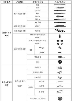 公司主要产品包括底盘零部件(细分为转向器类零部件、减振器类零部件、差速器类零部件、高精密类零部件)、铝合金轻量化零部件、空调压缩机及热管理系统,具体介绍如下: