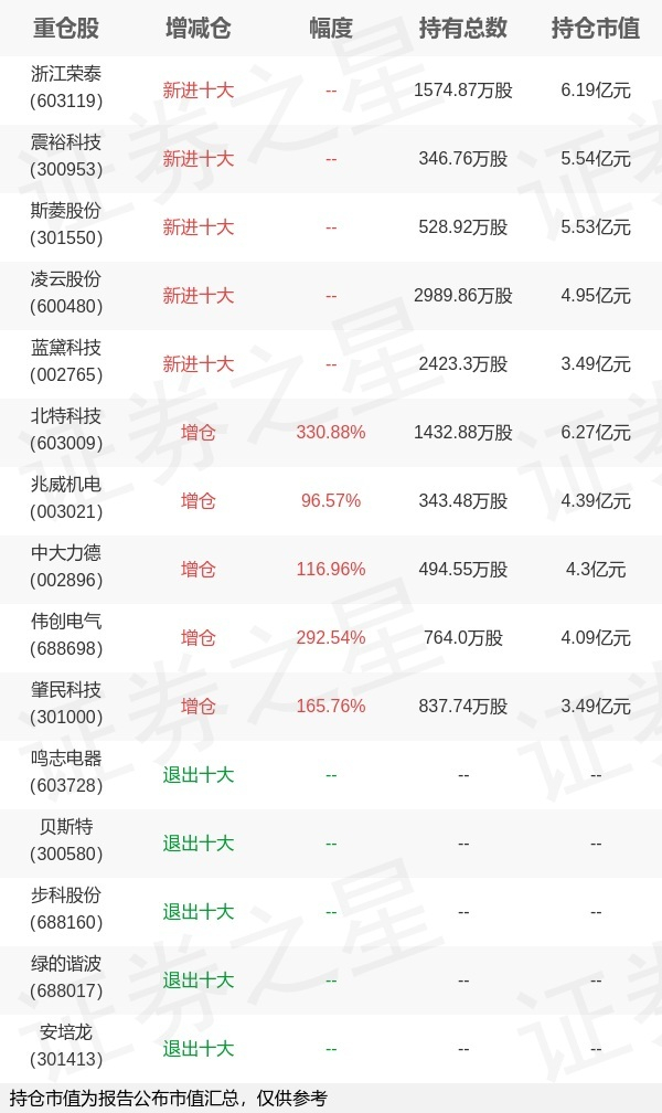 证券之星消息,4月21日永赢基金旗下张璐管理的永赢先进制造智选混合型发起式基金公布一季报,近1年净值增长率82.84%。与上一季度相比,该基金前十大重仓股新增浙江荣泰,震裕科技,斯菱股份,凌云股份,蓝黛科技;并对北特科技增仓1100.33万股,为该基金第一大重仓股;鸣志电器,贝斯特,步科股份,绿的谐波,安培龙等退出前十大重仓股;详细数据如下: