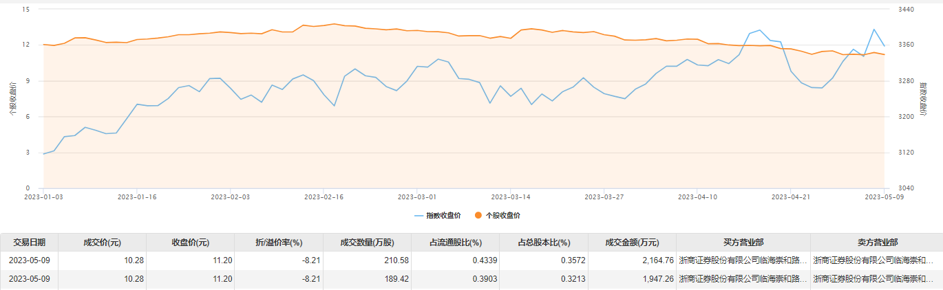 5月9日大宗交易成交400万股,成交额4112.02万元,占当日总成交额的65.73%,成交价10.28元,较市场收盘价11.2元折价8.21%。
