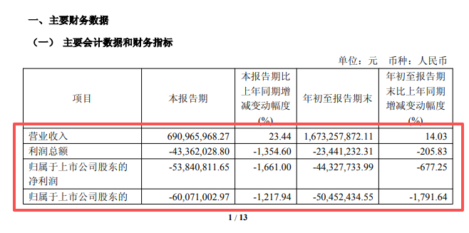 根据财报,公司前三季度实现营收约16.73亿元,同比增长14.03%;归母净利润亏损约4433万元,同比下降677.25%;经营性现金流量净额约1.81亿元,同比下降3.12%。