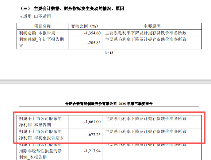 归母净利润方面,2025年第三季度,合锻智能归母净利润录得亏损约5384万元,同比下降1661%。前三季度,公司归母净利润亏损约4433万,同比下降677.25%。对比今年上半年公司归母净利润约为951万元,合锻智能由盈转亏。