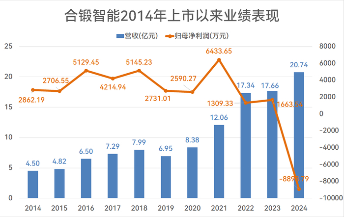 自上市后,合锻智能营收规模整体呈上升趋势,2014年底营收仅4.5亿元,2024底营收升至20.74亿元。不过,公司净利润却未随着营收增长而同步增长,且始终未突破1亿元,2021年曾达到高峰6433.65万元,2024年底则首次亏损8898.79万元。