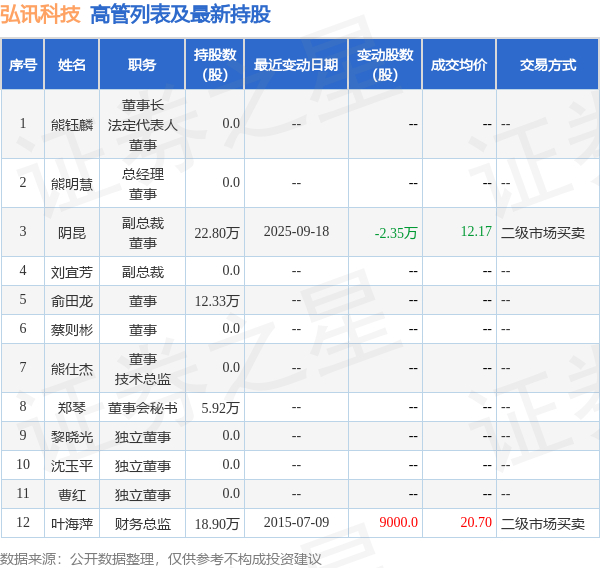 弘讯科技近半年内的董监高及核心技术人员增减持详情如下: