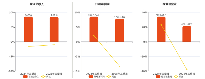 公司营业总收入为4.65亿元,在已披露的同业公司中排名第71,较去年同报告期营业总收入减少490.20万元,同比较去年同期下降1.04%。归母净利润为4781.12万元,在已披露的同业公司中排名第56,较去年同报告期归母净利润减少436.67万元,同比较去年同期下降8.37%。经营活动现金净流入为4881.02万元,在已披露的同业公司中排名第37,较去年同报告期经营活动现金净流入减少2977.23万元,同比较去年同期下降37.89%。
