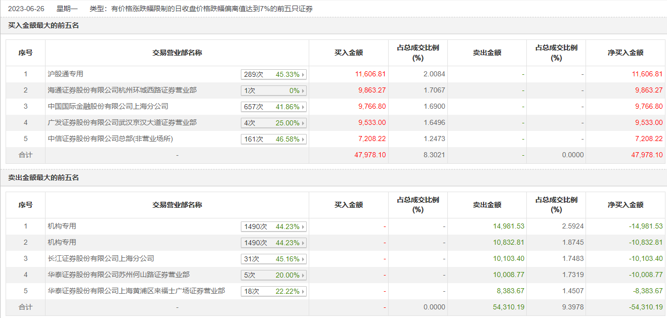 中科曙光6月26日跌停,龙虎榜数据显示,上榜营业部席位全天成交10.23亿元,占当日总成交金额比例为17.7%。其中,买入金额为4.8亿元,卖出金额为5.43亿元,合计净卖出6332.08万元。