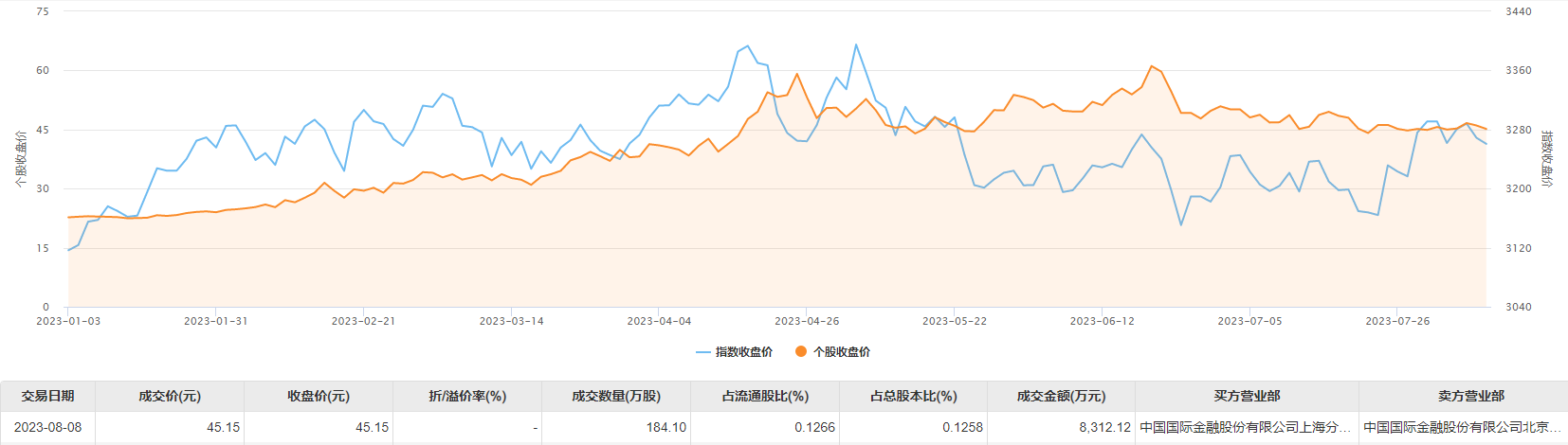 今日大宗交易成交184.1万股,成交额8312.12万元,占当日总成交额的5.14%,成交价45.15元,较市场收盘价45.15元持平。