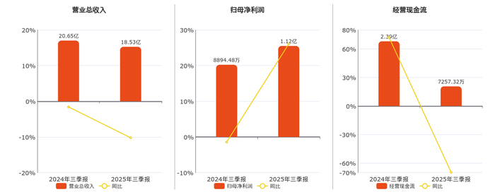 公司营业总收入为18.53亿元,较去年同报告期营业总收入减少2.12亿元,同比较去年同期下降10.24%。归母净利润为1.12亿元。经营活动现金净流入为7257.32万元,较去年同报告期经营活动现金净流入减少1.67亿元,同比较去年同期下降69.66%。