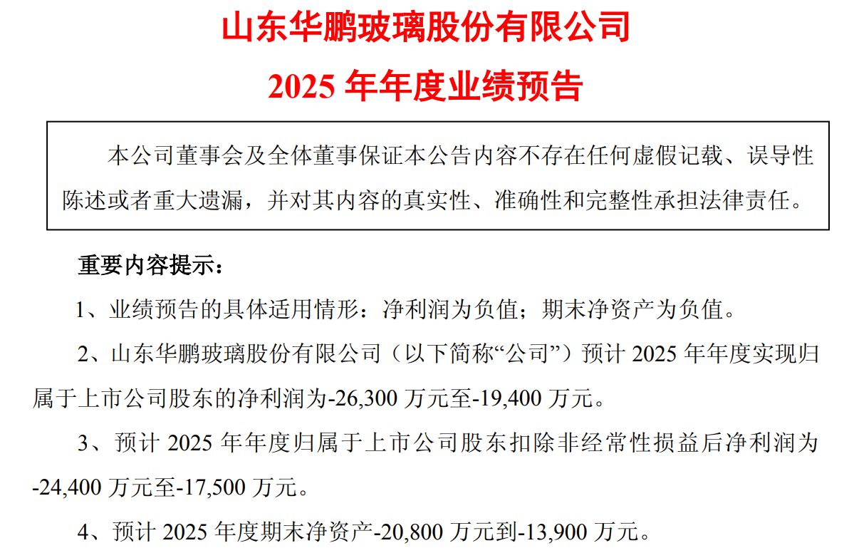 1月23日晚间,ST华鹏发布的《关于股票可能被实施退市风险警示的风险提示公告》显示,经财务部门初步测算,预计2025年度期末净资产为-2.08亿元至-1.39亿元。