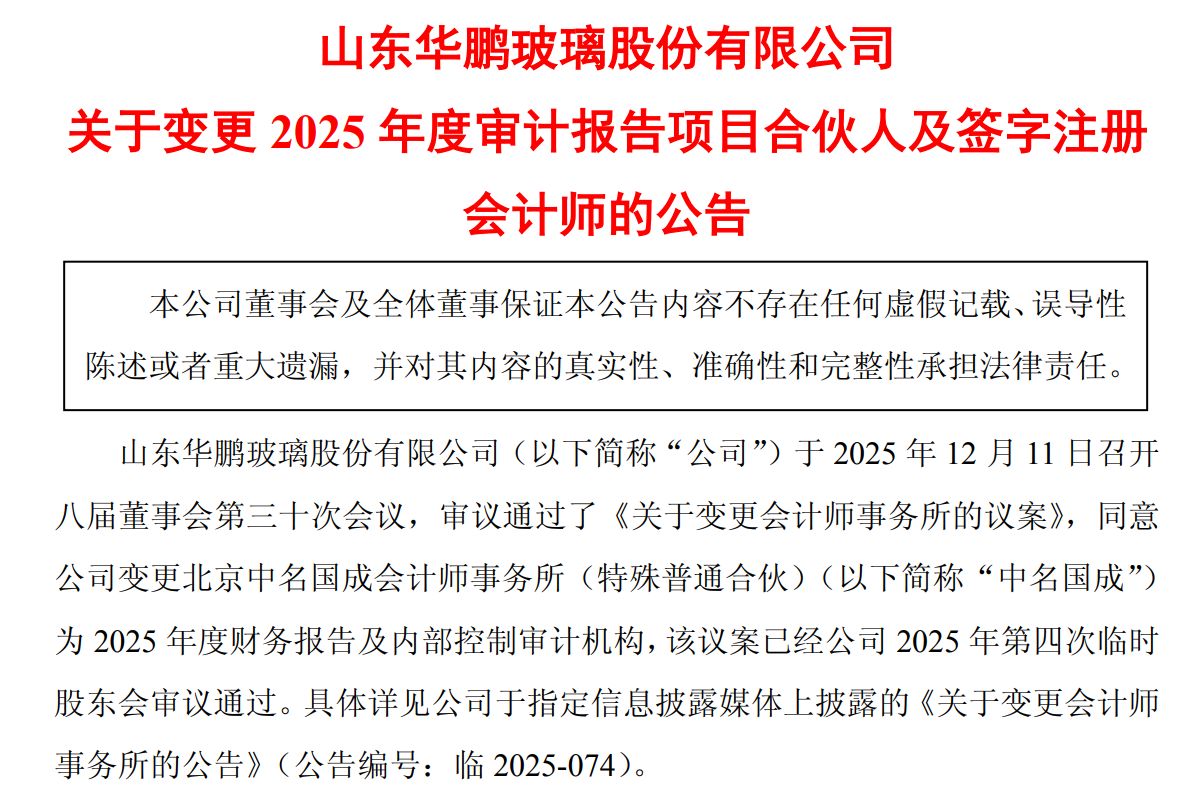 根据公告,ST华鹏于2025年12月11日召开八届董事会第三十次会议,审议通过了《关于变更会计师事务所的议案》。公司给出的理由是“基于公司业务发展情况及整体审计的需要”,并结合实际审计需求,拟聘任中名国成为公司2025年度财务审计机构和内部控制审计机构。这一议案随后在2025年12月29日召开的2025年第四次临时股东会上获得通过。