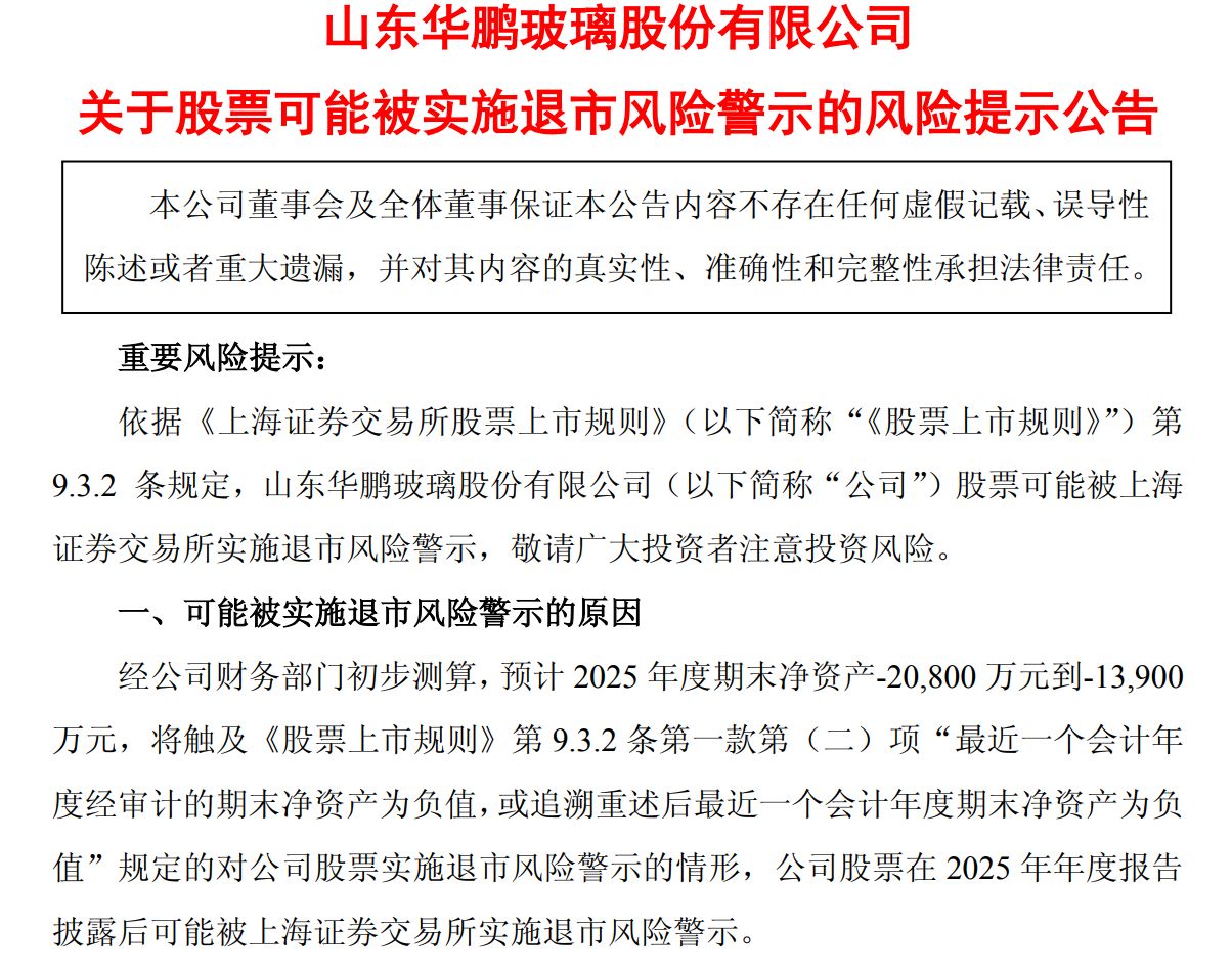 这意味着,ST华鹏将触及《上海证券交易所股票上市规则》第9.3.2条第一款第(二)项的规定,即“最近一个会计年度经审计的期末净资产为负值”。一旦2025年年度报告正式披露并确认该数据,公司股票将在年报披露后被实施退市风险警示(在证券简称前冠以“*ST”字样)。