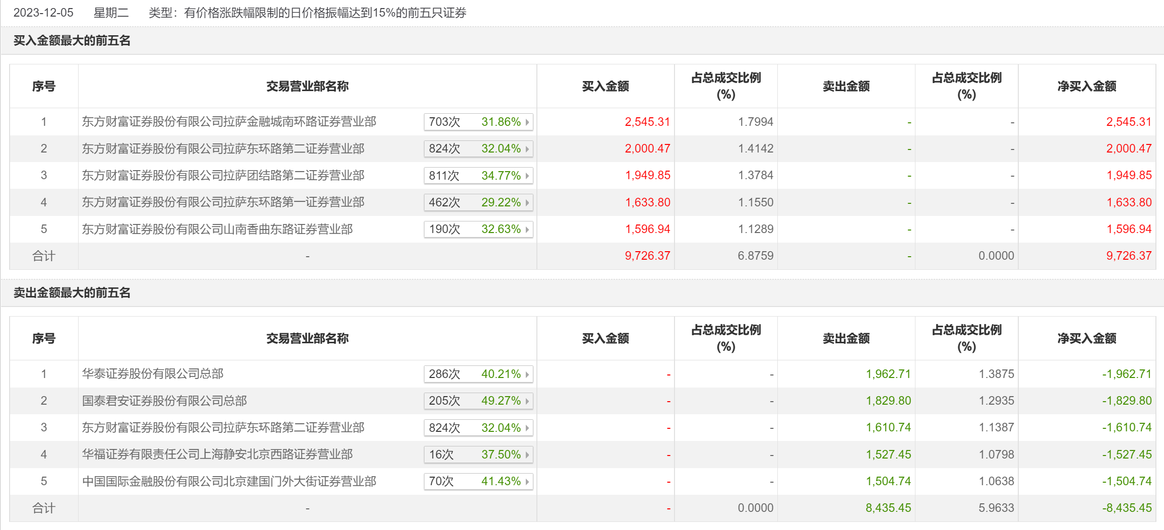 12月5日,威帝股份今日跌8.26%,全天换手率达33.89%,振幅达17.43%。龙虎榜数据显示,营业部席位合计净买入1290.93万元。其中,华泰证券总部、国泰君安证券总部分别卖出1962.71万元、1829.80万元;东方财富证券拉萨金融城南环路证券营业部、东方财富证券拉萨东环路第二证券营业部分别买入2545.31万元、2000.47万元。