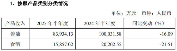 从产品端看,上半年公司两大核心品类增长动能失速,成为导致其经营承压的关键因素。报告期内,公司酱油产品实现收入8.39亿元,同比大幅下滑16.09%;食醋贡献收入1.59亿元,同比大幅下降21.51%,其中在第二季度,酱油和食醋营收分别同比下降31.06%和35.40%,同比降幅环比一季度进一步扩大。