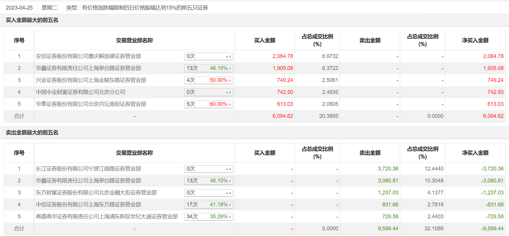 具体来看,知名游资现身龙虎榜,长江证券宁波江南路证券营业部、炒股养家(华鑫证券上海茅台路证券营业部)分别卖出3720.36万元、3080.81万元;安信证券重庆解放碑证券营业部、炒股养家(华鑫证券上海茅台路证券营业部)分别买入2084.78万元、1905.08万元。