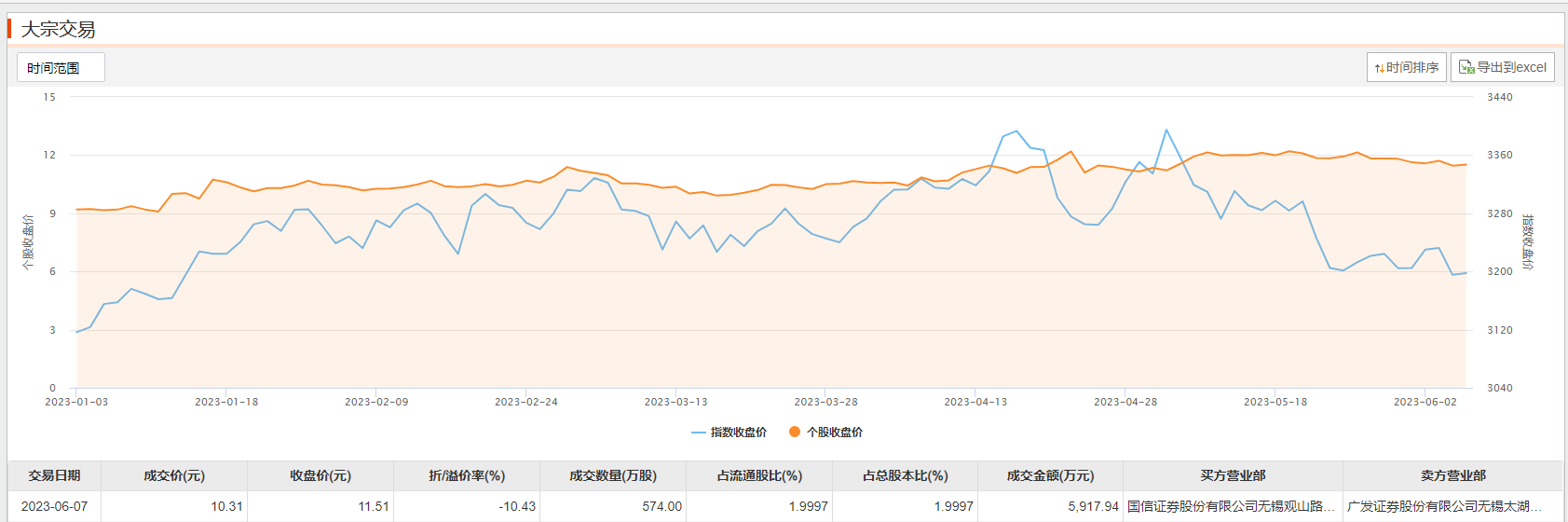 6月7日大宗交易成交574万股,成交额5917.94万元,占当日总成交额的80.26%,成交价10.31元,较市场收盘价11.51元折价10.43%。