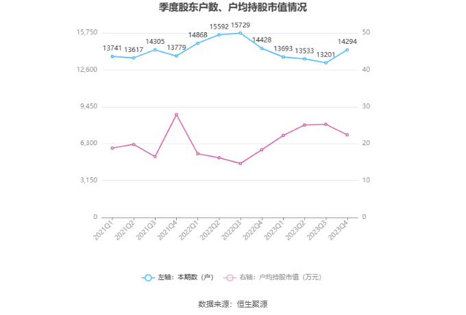 筹码集中度方面,截至2023年年末,公司股东总户数为1.43万户,较三季度末增长了1093户,增幅8.28%;户均持股市值由三季度末的25.24万元下降至22.39万元,降幅为11.29%。