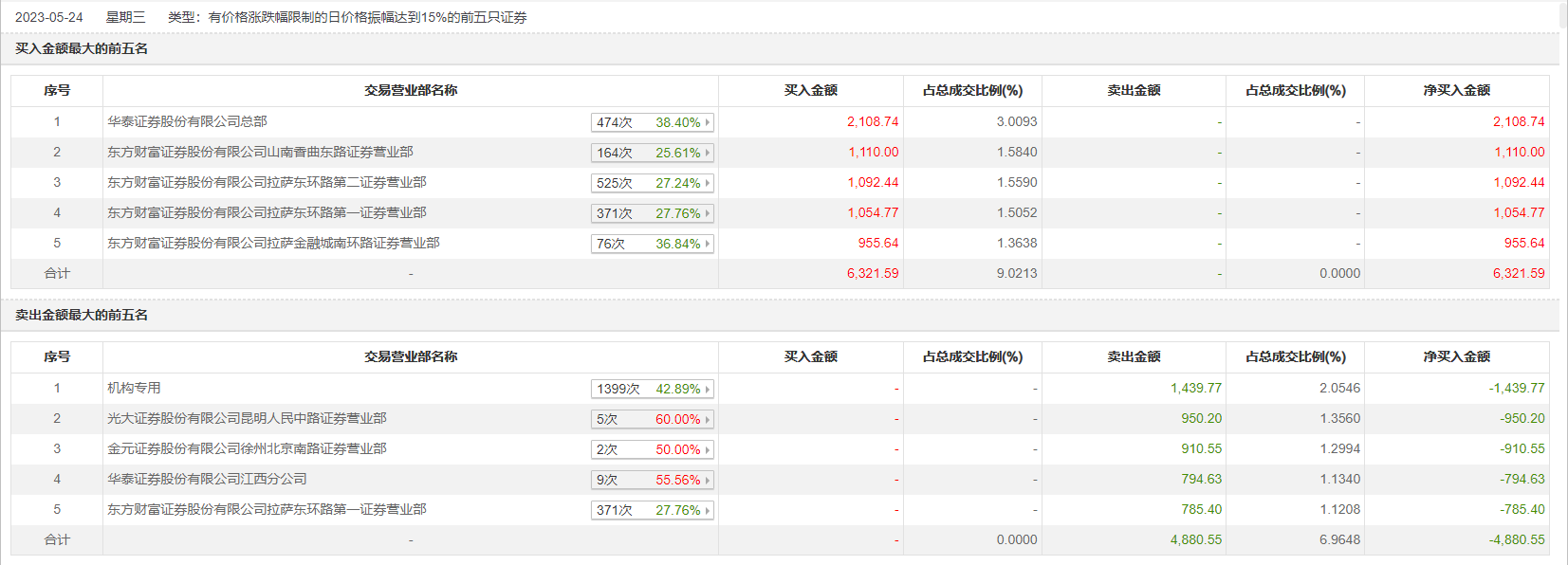 具体来看,机构合计净卖出1439.77万元。此外,华泰证券总部、东方财富证券山南香曲东路证券营业部分别买入2108.74万元、1110.00万元;光大证券昆明人民中路证券营业部、金元证券徐州北京南路证券营业部分别卖出950.20万元、910.55万元。