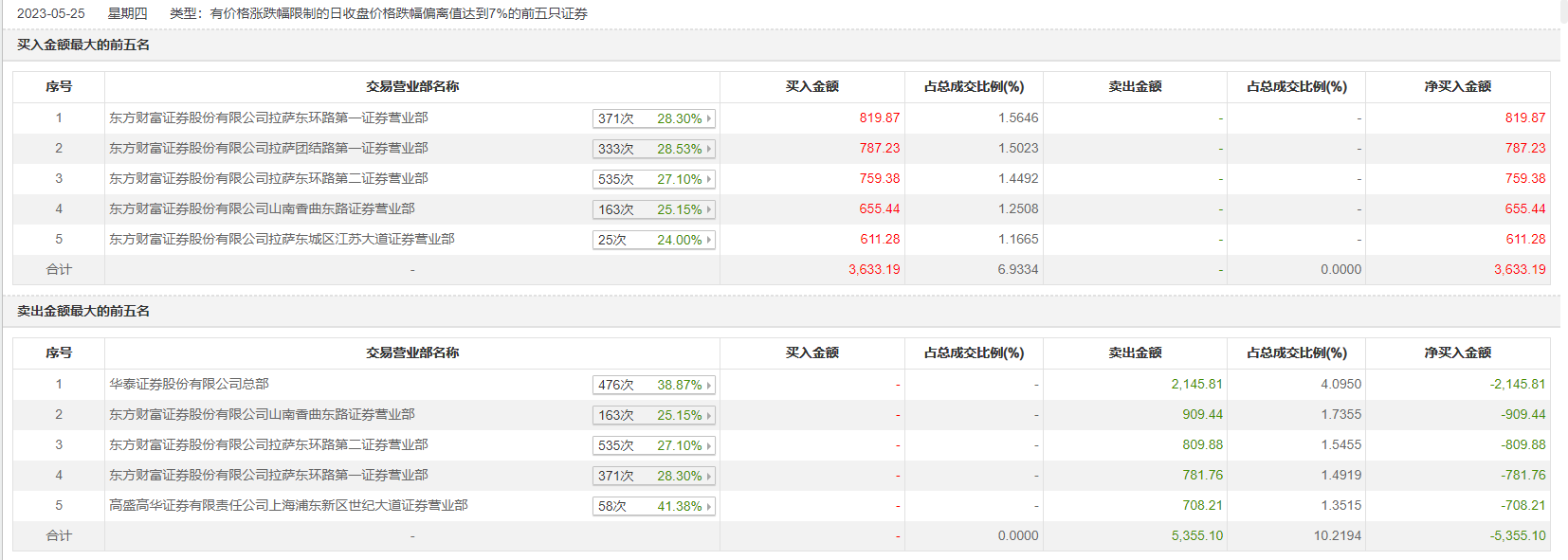具体来看,华泰证券总部、东方财富证券山南香曲东路证券营业部分别卖出2145.81万元、909.44万元;东方财富证券拉萨东环路第一证券营业部、东方财富证券拉萨团结路第一证券营业部分别买入819.87万元、787.23万元。