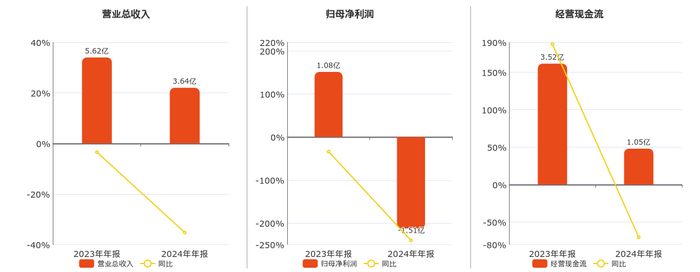 公司营业总收入为3.64亿元,在已披露的同业公司中排名第94,较去年同报告期营业总收入减少1.98亿元,同比较去年同期下降35.22%。归母净利润为-1.51亿元,在已披露的同业公司中排名第74,较去年同报告期归母净利润减少2.59亿元,同比较去年同期下降240.49%。经营活动现金净流入为1.05亿元,在已披露的同业公司中排名第52,较去年同报告期经营活动现金净流入减少2.47亿元,同比较去年同期下降70.25%。