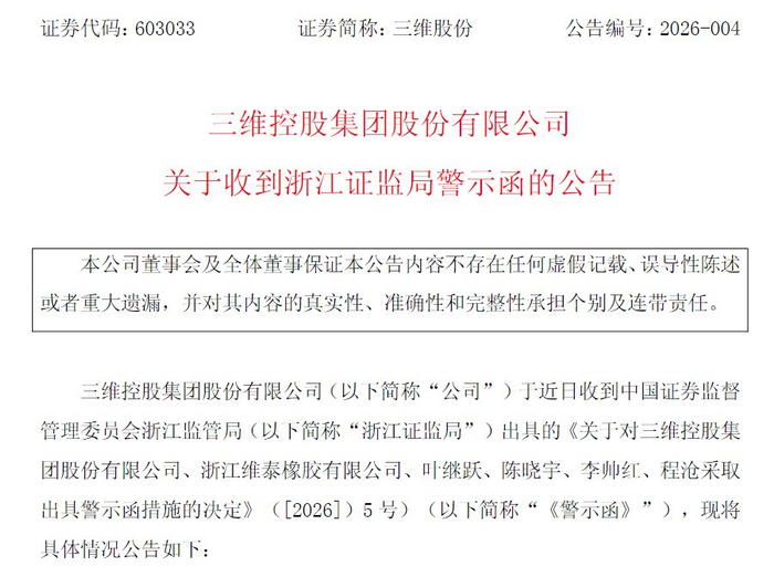 中新经纬1月16日电 16日盘后,三维控股集团股份有限公司(简称“三维股份”)公告,公司于近日收到浙江证监局出具的《关于对三维控股集团股份有限公司、浙江维泰橡胶有限公司、叶继跃、陈晓宇、李帅红、程沧采取出具警示函措施的决定》([2026])5号)(以下简称“《警示函》”)。