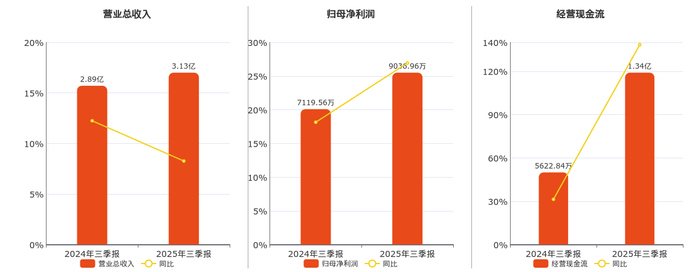 公司营业总收入为3.13亿元,在已披露的同业公司中排名第128。归母净利润为9036.96万元。经营活动现金净流入为1.34亿元。