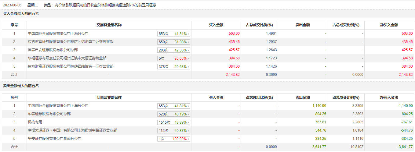 华立股份今日涨停,龙虎榜数据显示,上榜营业部席位全天成交5785.59万元,占当日总成交金额比例为17.19%。其中,买入金额为2143.82万元,卖出金额为3641.77万元,合计净卖出1497.95万元。
