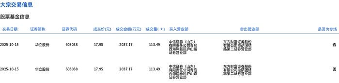 10月15日,华立股份大宗交易成交226.98万股,成交额4074.34万元,占当日总成交额的10.34%,成交价17.95元,较市场收盘价20.38元折价11.92%。