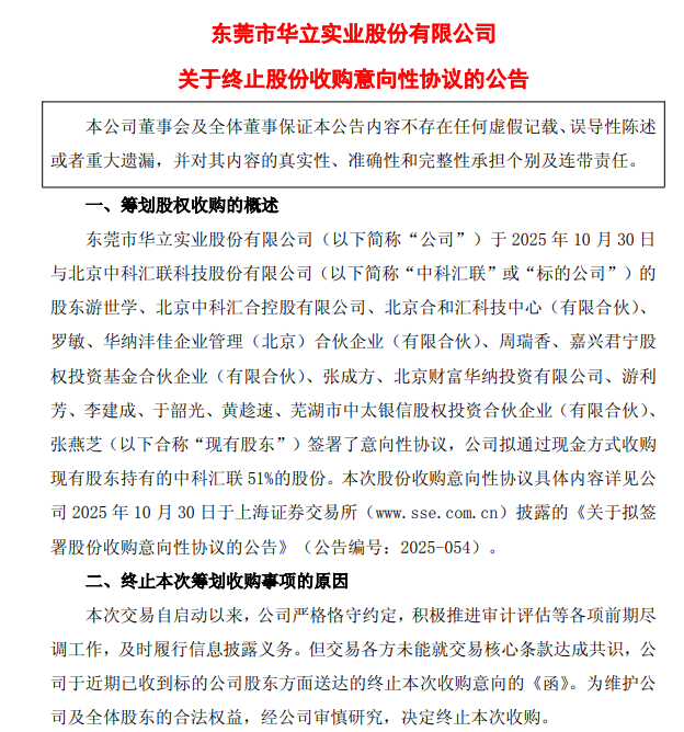 12月29日,华立股份(603038.SH)公告,公司于2025年10月30日与北京中科汇联科技股份有限公司(以下简称“中科汇联”或“标的公司”)现有股东签署了意向性协议,拟通过现金方式收购其51%股份。由于交易各方未能就核心条款达成共识,标的公司股东方面送达了终止收购意向的函。公司决定终止本次收购。