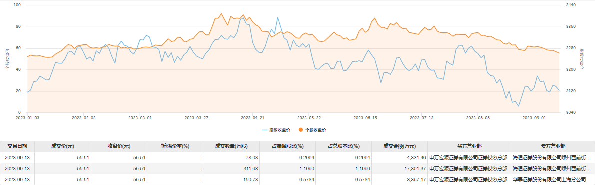 9月13日大宗交易成交540.44万股,成交额3亿元,占当日总成交额的84.53%,成交价55.51元,较市场收盘价55.51元持平。