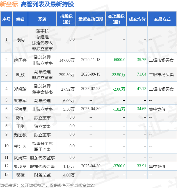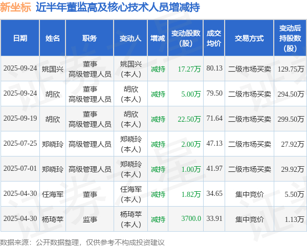 新坐标:9月24日高管姚国兴、胡欣减持股份合计22.27万股