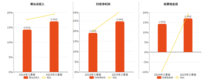 公司营业总收入为5.93亿元。归母净利润为2.09亿元。经营活动现金净流入为2.34亿元。
