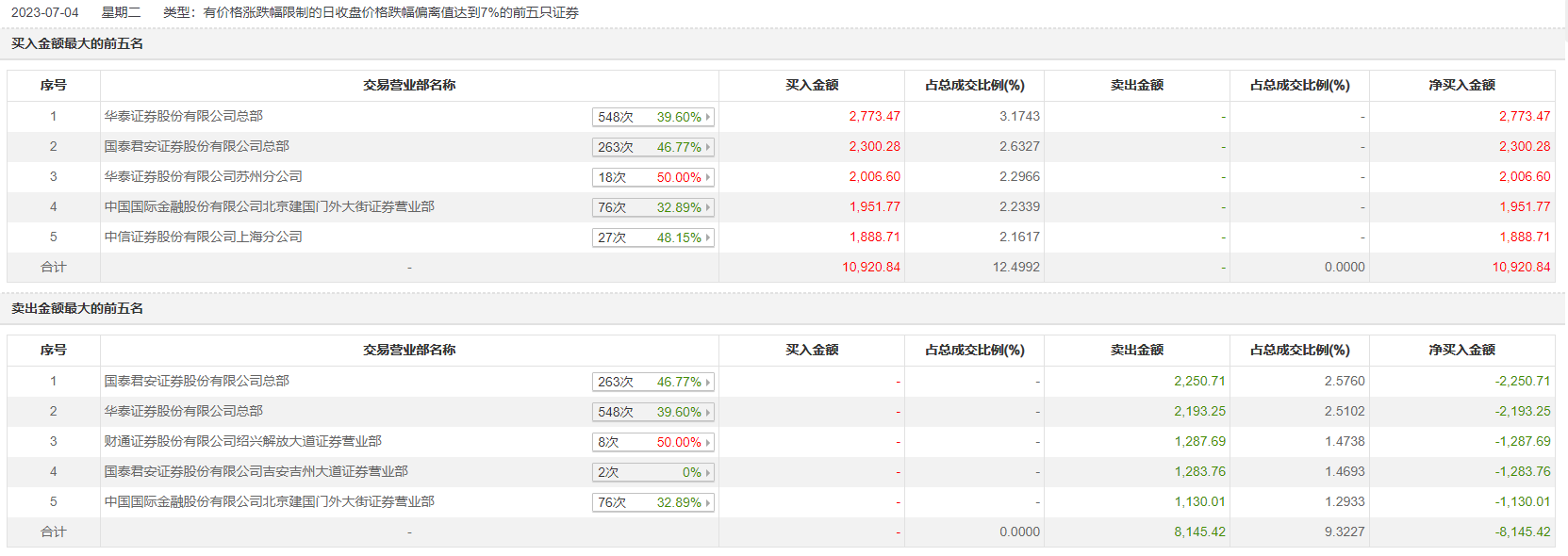 具体来看,国泰君安证券总部、华泰证券总部分别卖出2250.71万元、2193.25万元;华泰证券总部、国泰君安证券总部分别买入2773.47万元、2300.28万元。
