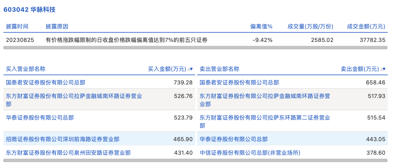 8月25日,华脉科技今日跌停,龙虎榜数据显示,上榜营业部席位全天成交5200.71万元,占当日总成交金额比例为13.76%。其中,买入金额为2687.13万元,卖出金额为2513.58万元,合计净买入173.55万元。