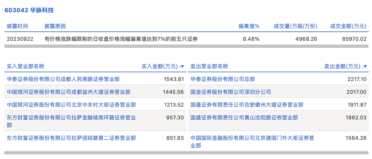 9月22日,华脉科技今日涨停,龙虎榜数据显示,上榜营业部席位全天成交1.56亿元,占当日总成交金额比例为18.13%。其中,买入金额为6012.13万元,卖出金额为9572.26万元,合计净卖出3560.14万元。