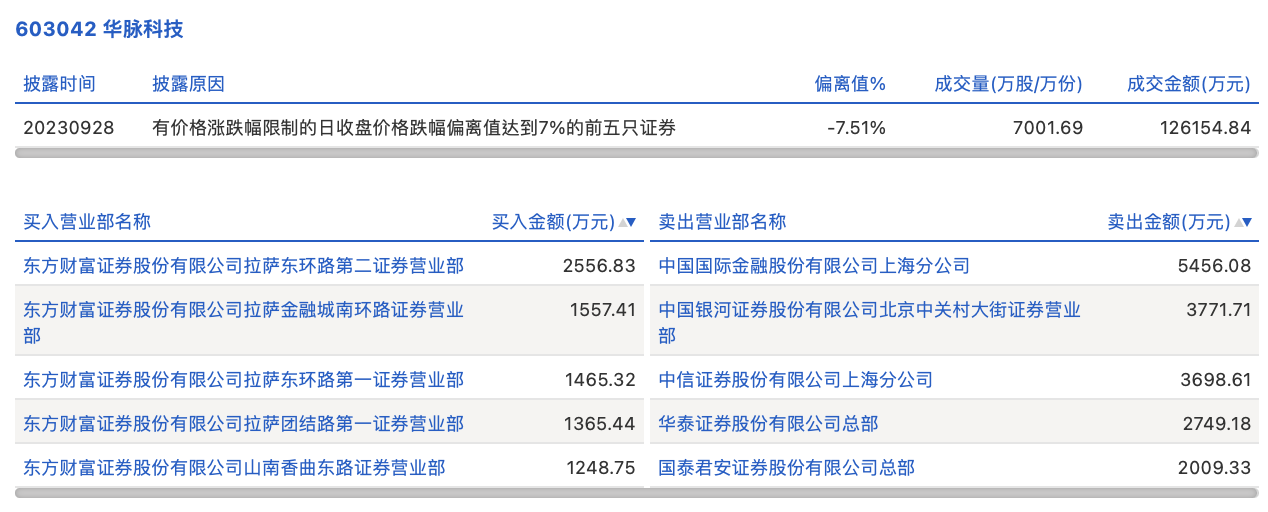 9月28日,华脉科技今日跌7.4%,全天换手率达43.6%,振幅达8.87%。龙虎榜数据显示,营业部席位合计净卖出9491.16万元。其中,中国国际金融上海分公司、中国银河证券北京中关村大街证券营业部分别卖出5456.08万元、3771.71万元;东方财富证券拉萨东环路第二证券营业部、东方财富证券拉萨金融城南环路证券营业部分别买入2556.83万元、1557.41万元。