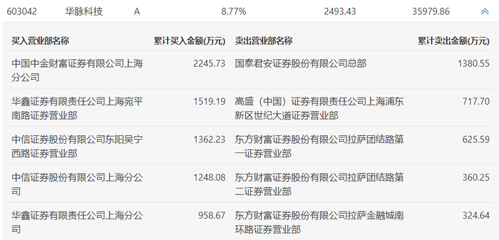 华脉科技今日涨停,龙虎榜数据显示,上榜营业部席位全天成交1.07亿元,占当日总成交金额比例为29.86%。其中,买入金额为7333.9万元,卖出金额为3408.73万元,合计净买入3925.16万元。
