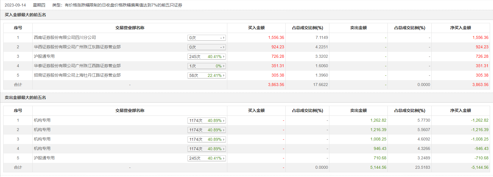 具体来看,机构合计净卖出4433.89万元。此外,沪股通专用分别卖出710.68万元;西南证券四川分公司、华西证券广州珠江东路证券营业部分别买入1556.36万元、924.23万元。