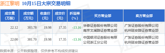 10月15日浙江黎明现2笔折价13.16%的大宗交易 合计成交765.48万元