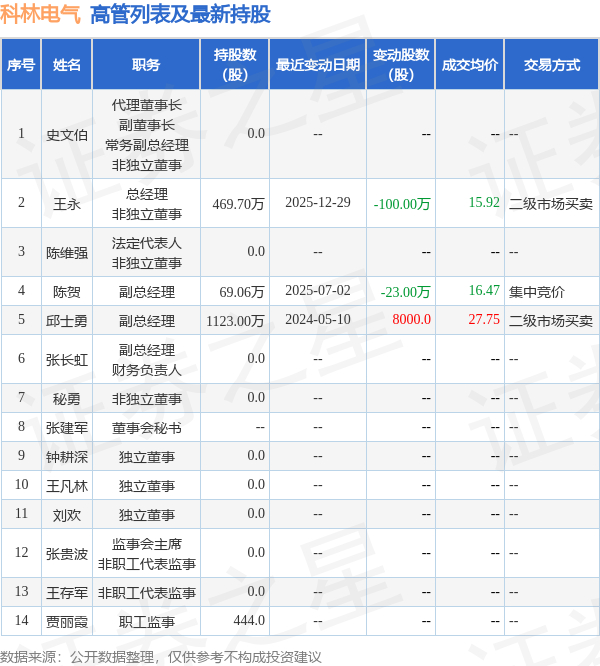 科林电气的高管列表及最新持股情况如下: