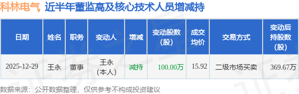 科林电气:12月29日高管王永减持股份合计100万股
