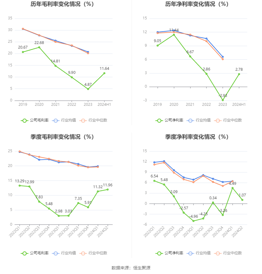 2024年上半年,公司毛利率为11.64%,同比上升8.63个百分点;净利率为2.78%,较上年同期上升7.38个百分点。从单季度指标来看,2024年第二季度公司毛利率为11.96%,同比上升8.93个百分点,环比上升0.64个百分点;净利率为1.07%,较上年同期上升5.32个百分点,较上一季度下降3.42个百分点。