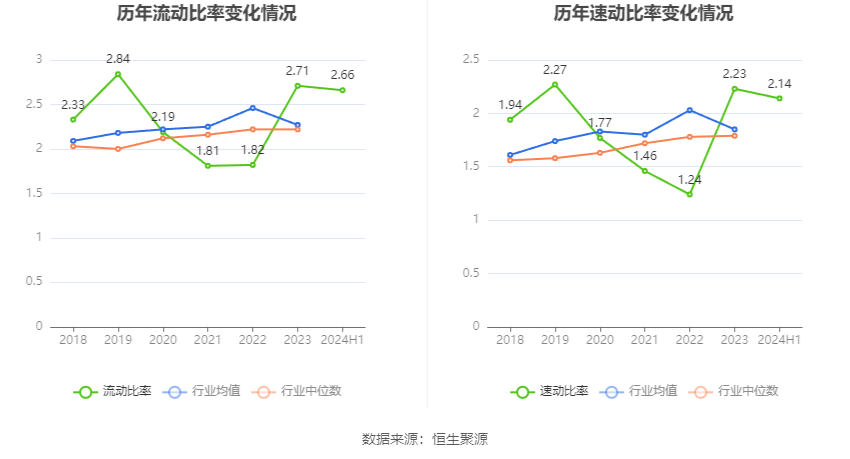 2024年上半年,公司流动比率为2.66,速动比率为2.14。