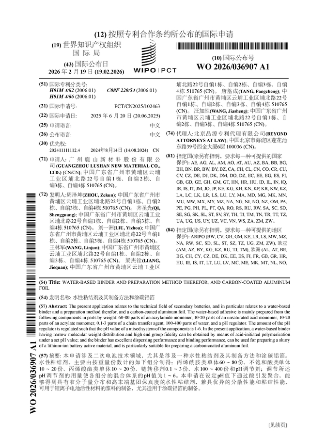 鹿山新材公布国际专利申请:“水性粘结剂及其制备方法和涂碳铝箔”